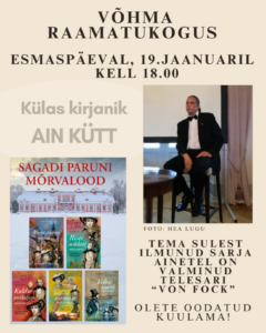 19. jaanuaril esineb Võhma raamatukogus kirjanik Ain KüttBy Monika Jõemaa / 19. jaan. 2026 When 19. jaan. 2026 18:00 - 19:00 Add To Calendar Download ICS Google Calendar iCalendar Office 365 Outlook Live Where Võhma Raamatukogu Veski 11, Võhma Event Type Kohtumine
